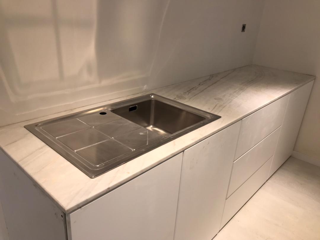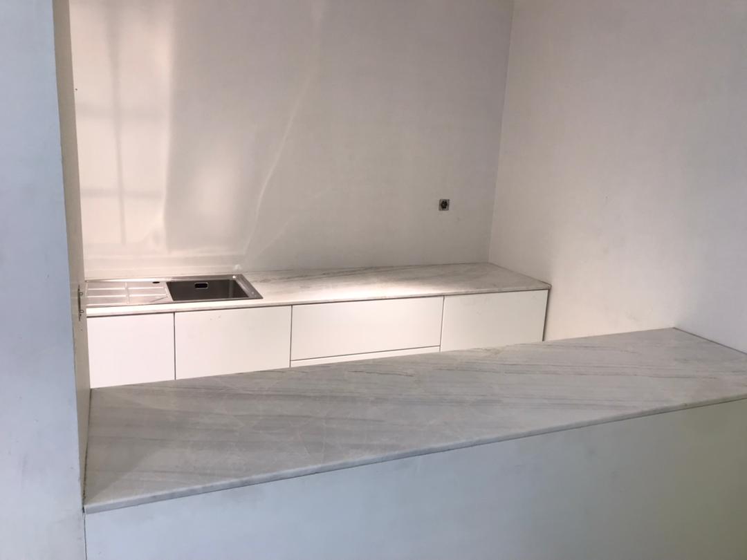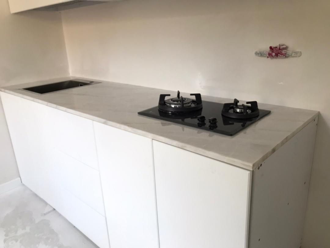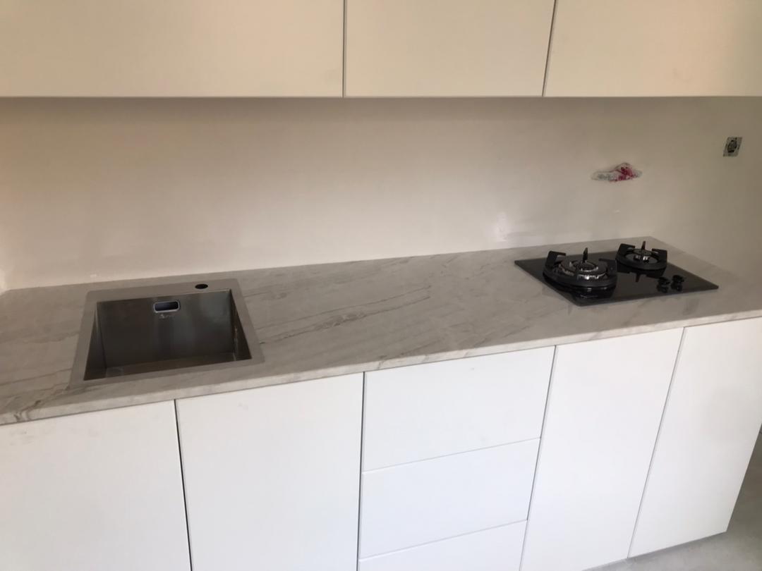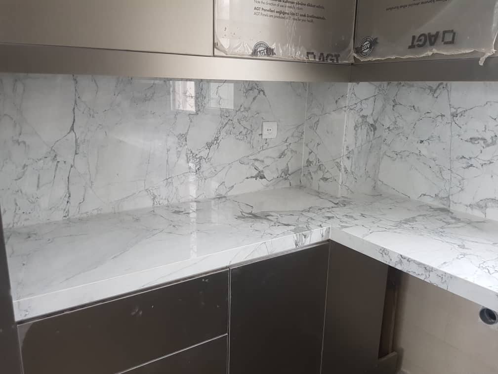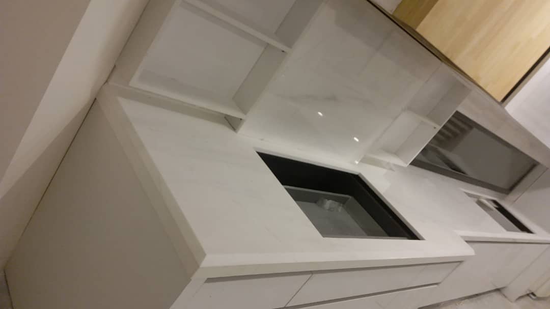 سنگ چینی سفید الیگودرز اجرا شده بصورت مدرن روی کانتر آشپزخانه مکان پروژه مهرشهر کرجزمان نصب تیر 97