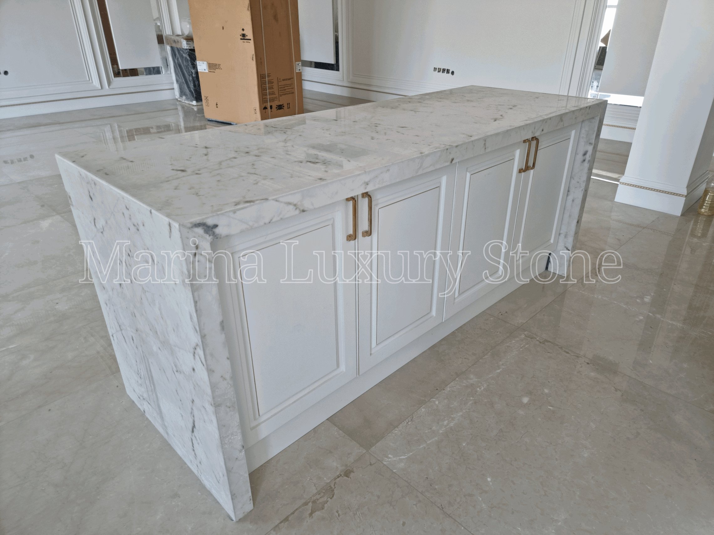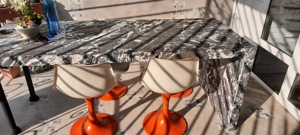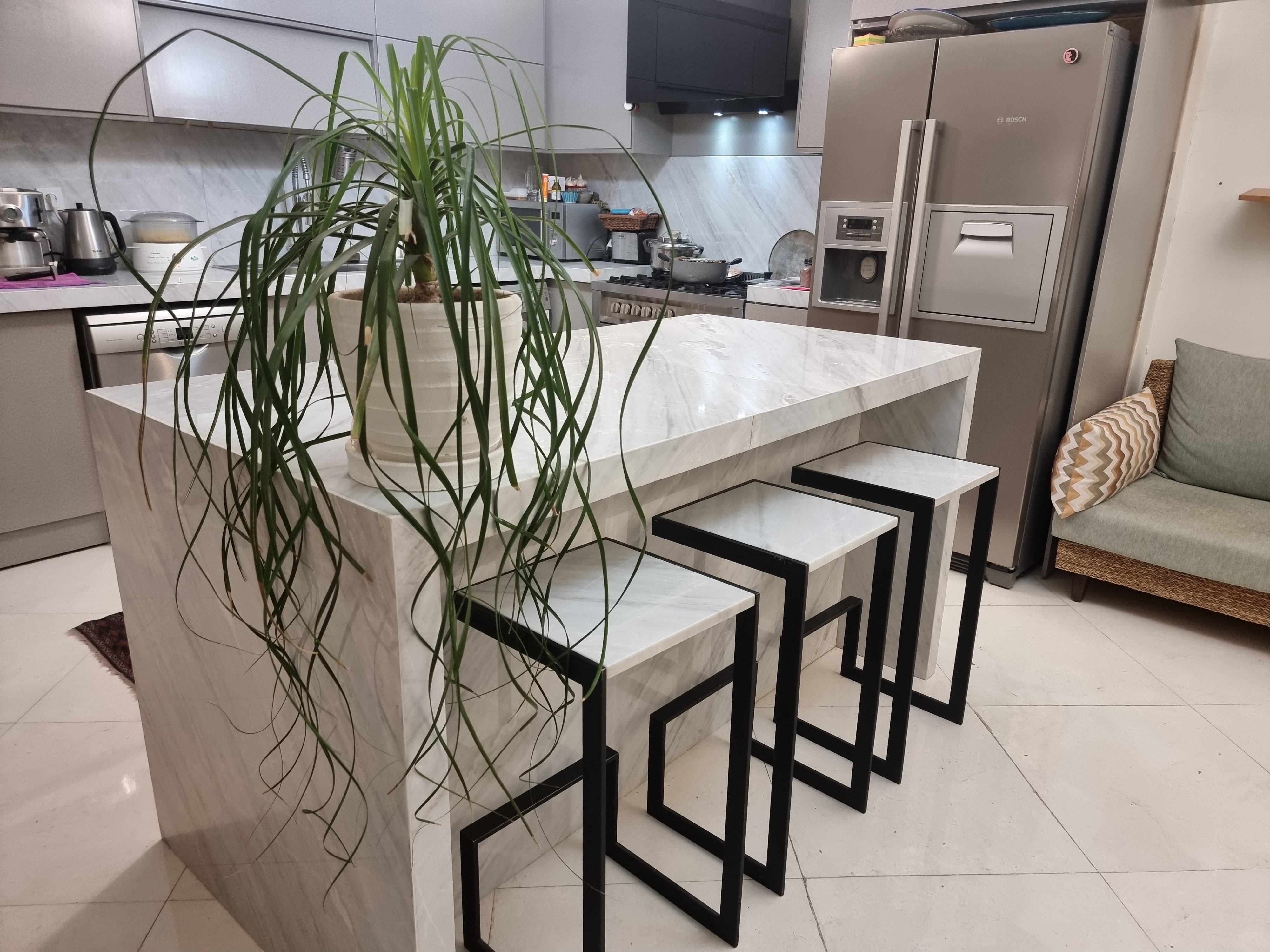 سنگ مرمریت دهبید اجرا شده بصورت مدرن فارسی ۴ سانت روی کانتر آشپزخانه و میز بارمکان پروژه قیطریهزمان نصب آبان ۱۴۰۳
