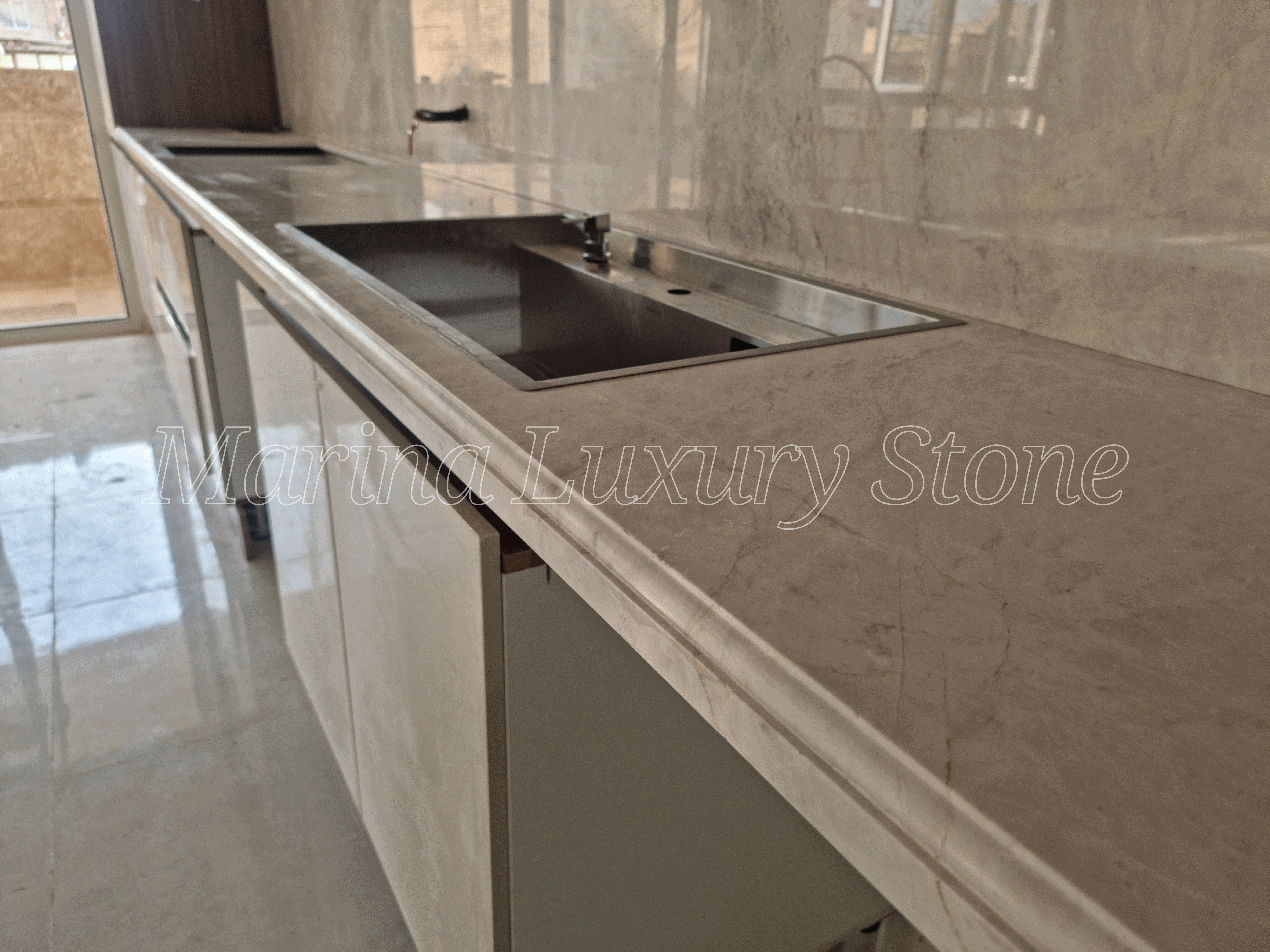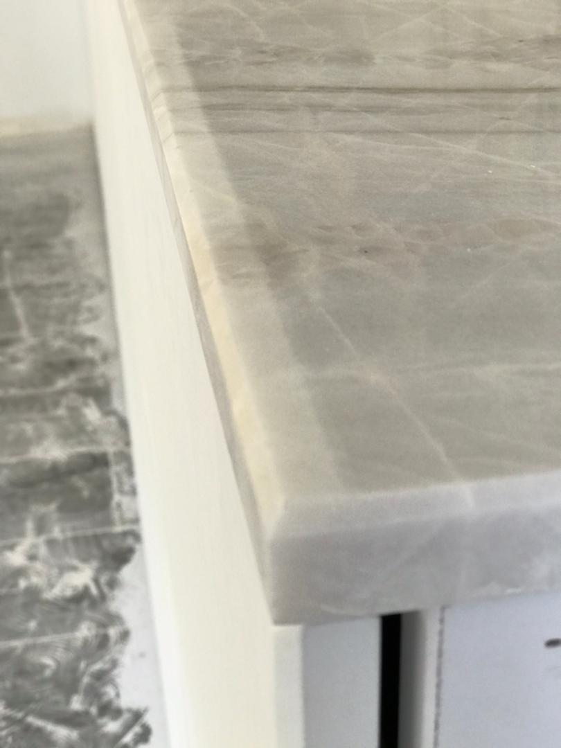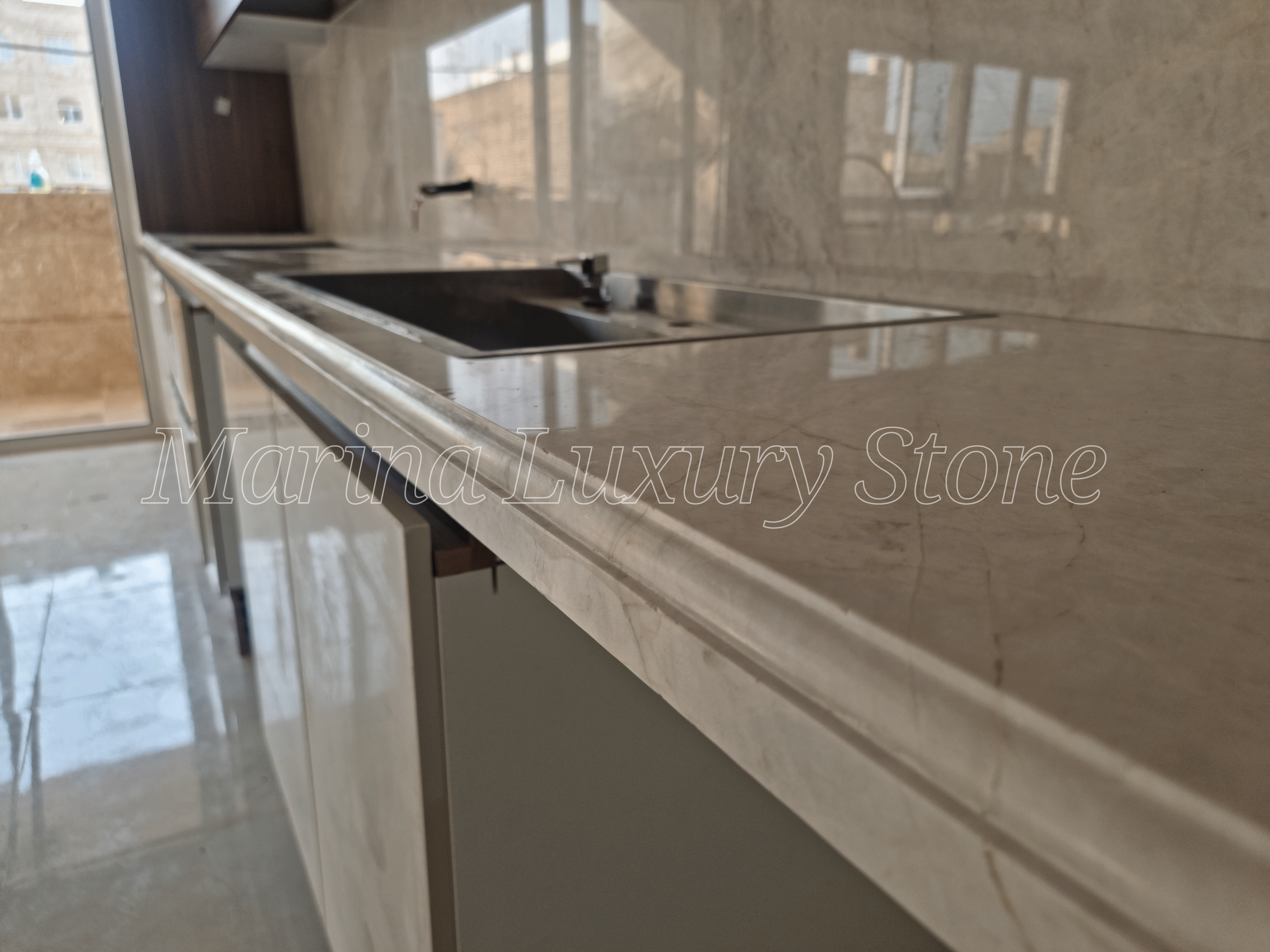 سنگ مرمریت نجف آباد اجرا شده بصورت مدرن پخ ۴۵ درجه ضخامت ۴ سانت روی کانتر آشپزخانهمکان پروژه خیابان نبردزمان نصب مهر ۱۴۰۳